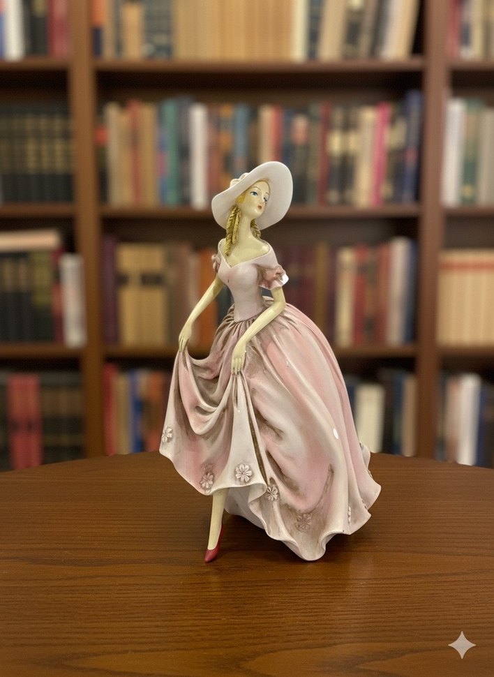 Bu biblo, geniş şapkalı ve pastel pembe elbiseli bir kadını zarif bir şekilde eteğini tutarken gösterir. İnce çiçek detaylarına sahiptir. Hasarı yok çok iyi bakılmış bir ürün. Taşındığım için satıyorum.