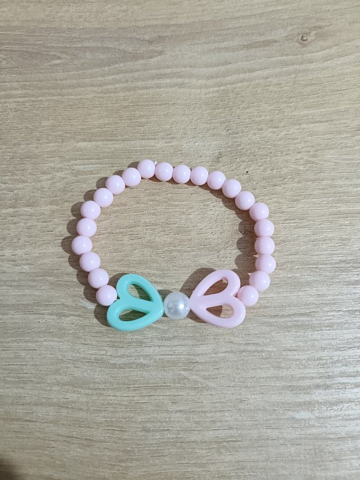 Pastel pembe boncuklardan oluşan kız çocuk bilekliği, pastel yeşil ve pembe fiyonk detayları ve ortasında inci boncuk ile sade ve bohem tarzda günlük kullanıma uygun.
