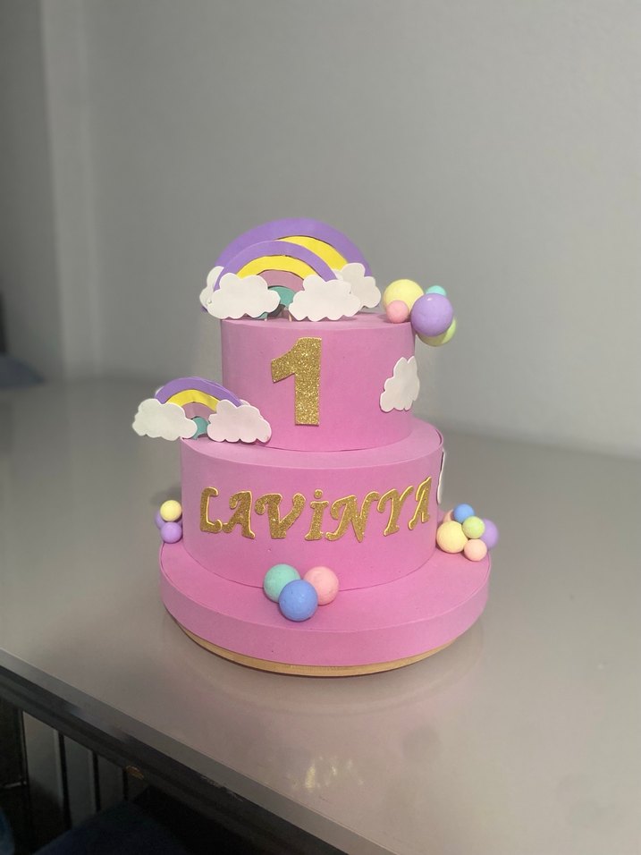 İki katmanlı pastel pembe pasta süsü, gökkuşakları, bulutlar ve renkli toplarla, altın harflerle 1 sayısı ve Lavinya ismiyle süslenmiş