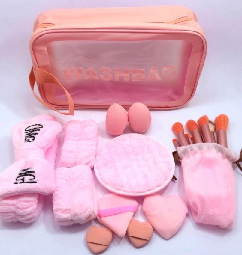 Pastel pembe renkte, ön kısmında 'WASHBAG' yazısı bulunan şeffaf panelli plastik kadın makyaj çantası. Ve içindeki setler. Günlük kullanım için zarif ve rahat bir tasarım sunar. 3 renkte stokta. ORJİNAL ve UTS kayıtlı gönderim. Premium satıcıyız Güvenilir alışveriş.