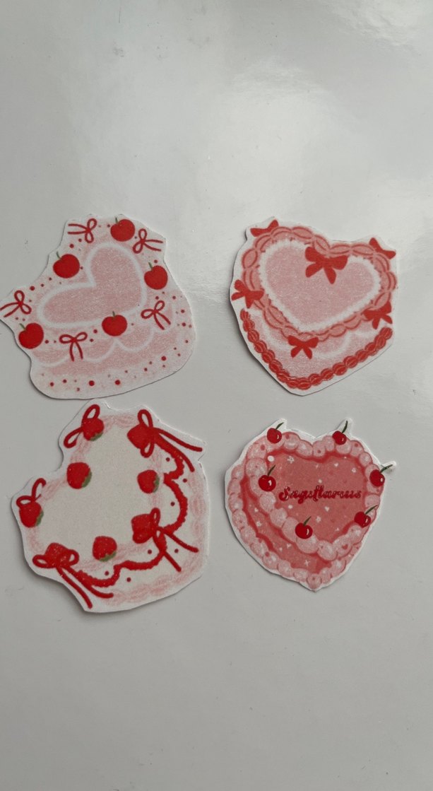 Yapışkanlı sticker Pembe pastel tonlarda, fiyonk ve kiraz desenli kalp şeklinde sticker.