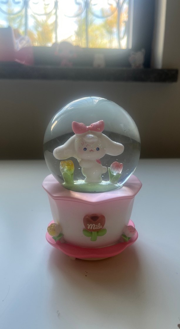Pembe pastel renkte, kurdeleli sevimli bir tavşan figürlü kar küresi. Altında "Mile" yazısı ve çiçek desenleri bulunuyor.