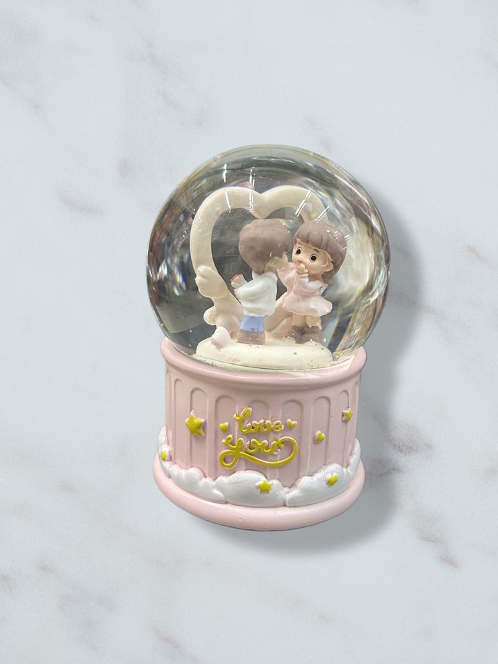 Pembe pastel renkte, içinde kalp şekilli çerçeve tutan çocuk figürlü kar küresi. Alt kısmı bulut ve yıldız süslemeli, üzerinde altın renginde "Love you" yazısı bulunur. ❤️