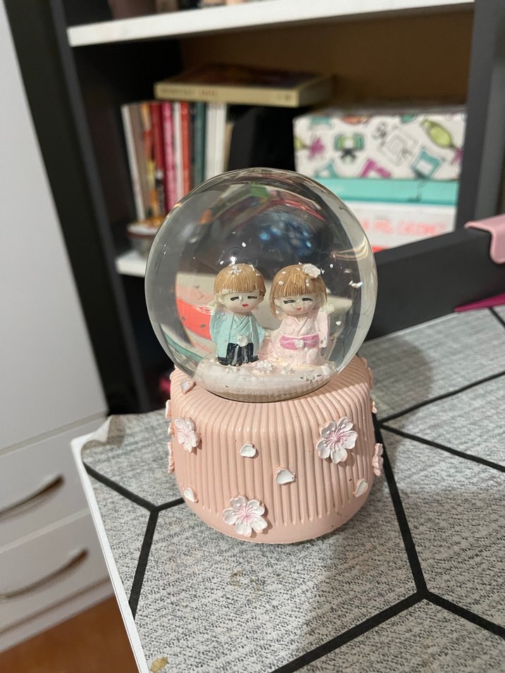 İki küçük figürün bulunduğu pastel pembe kar küresi. Tabanı çiçek detaylarıyla süslenmiştir. ❄️
