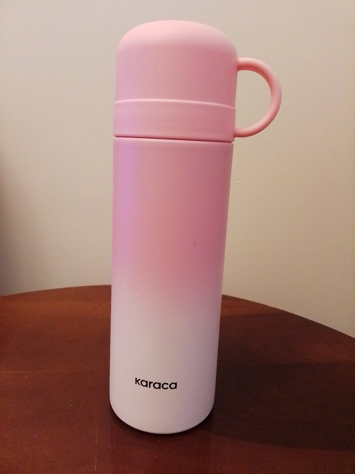 Karaca marka, pastel pembe renkte, kapakta saplı termos. İçecekleri sıcak tutmak için uygundur. ☕