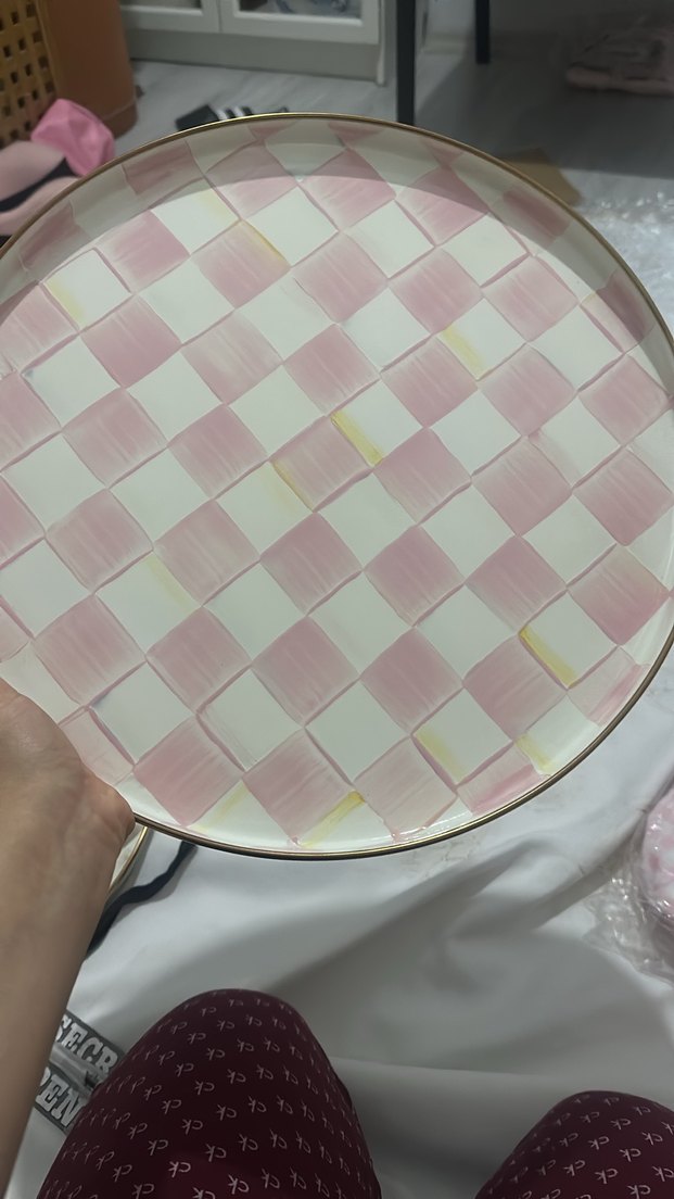 Pembe ve beyaz pastel kareli desene sahip, ince altın renkli kenarı bulunan çağdaş tabak. Sofistike bir sunum için uygundur. ️