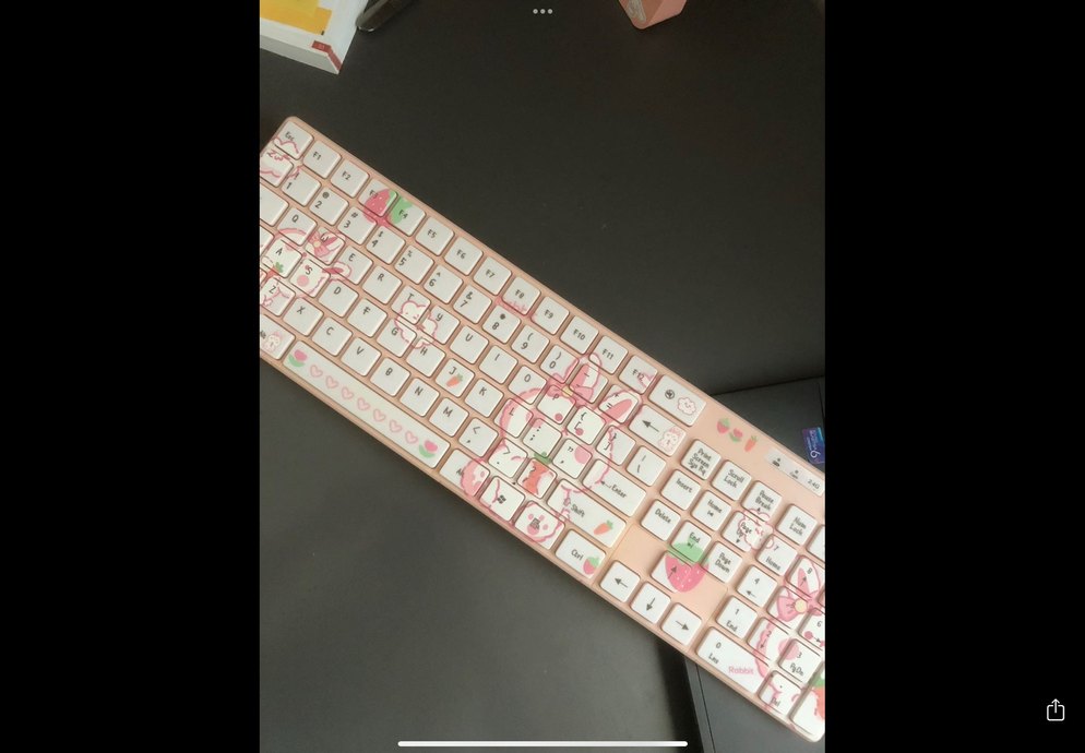 Pembe pastel renkte, kalp ve çilek desenli tuşlara sahip standart numerik klavye.Bluetoothludur.Kablolu ya da kablosuz kullanılır temiz ve bir sorunu yoktur