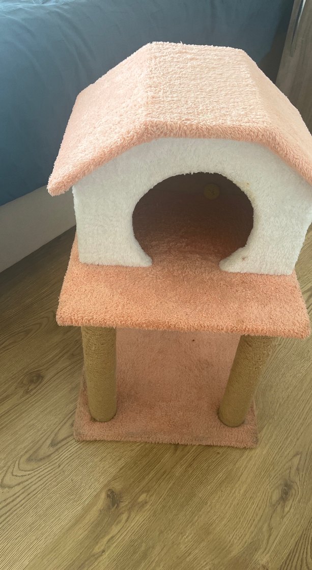 Pastel pembe renkte, kapalı alanı ve tırmalama direği bulunan rahat bir kedi evidir .
