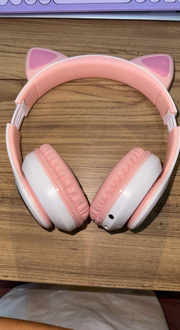 Pastel pembe renkte, yumuşak kulak yastıkları ve kedi kulaklı sevimli tasarıma sahip kulaklık. Rahat kullanım sağlar.
