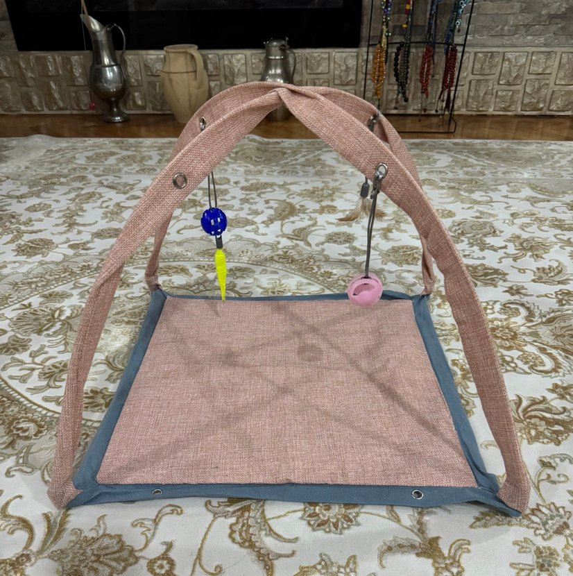 Pastel pembe renkte, asılan oyuncaklar ve yumuşak kumaş tabanlı kedi oyun halısı.