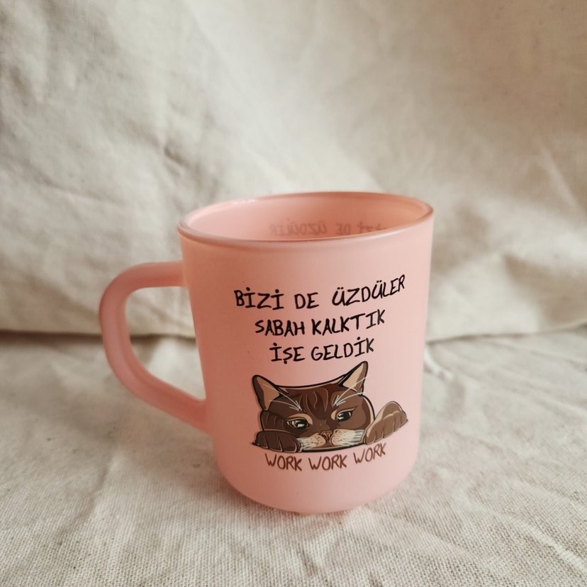Pastel pembe renkli cam kupa, üzerinde kedi resmi ve "Sabah kalktık işe geldik bizi de üzdüler" yazısı bulunur.