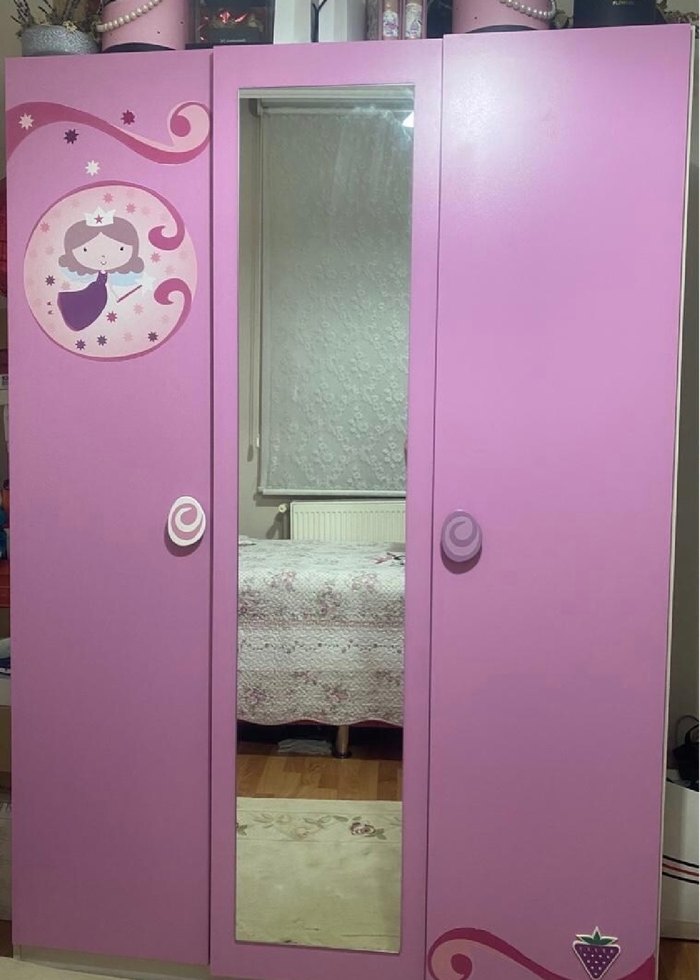 Pembe pastel renkte, tam boy ayna ve kapıda peri figürü bulunan üç kapılı çocuk gardırop. Yuvarlak kulpları ile kolay kullanım sağlar.çilek marka ankaradan teslim