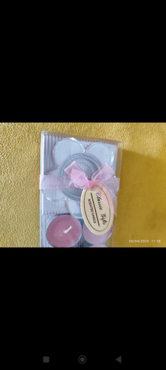Pastel pembe renkte, yumuşak kokulu mum seti. Şeffaf mumluk içinde, pembe kurdele ile süslenmiştir. ️ 4 lü mum seti. 4 mum 1 mumluk