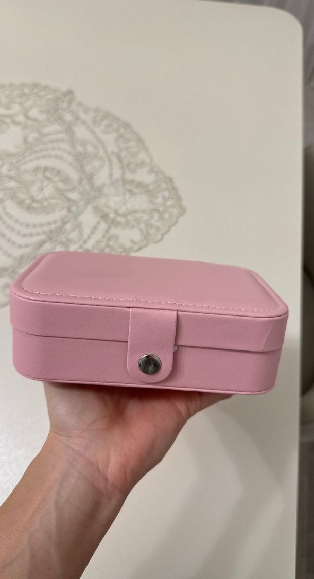Pastel pembe renkte, düğmeli kapaklı makyaj düzenleyici kutusu, kozmetiklerinizi düzenli tutmak için uygundur.