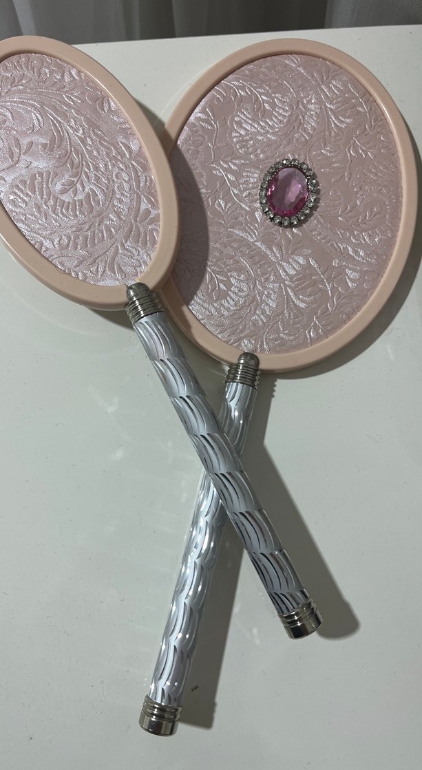 Pembe pastel renkte, dekoratif taşlı ve kabartmalı desenli makyaj fırçası, gümüş detaylı dokulu sapla birlikte.