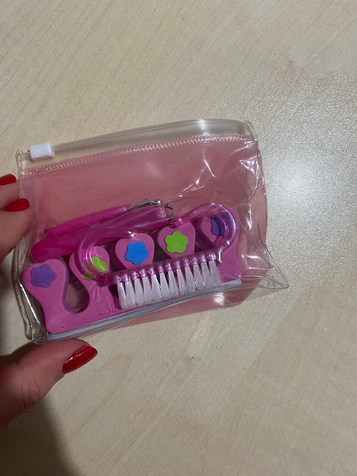 Pembe pastel renkte tırnak makası, törpü, parmak ayırıcı ve küçük fırça içeren manikür pedikür seti, şeffaf çantada saklanır.