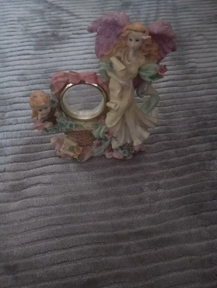 Pembe pastel renkte, kanatlı bir melek ve küçük bir melek figürü bulunan dekoratif obje, yuvarlak bir boşluk içerir.
