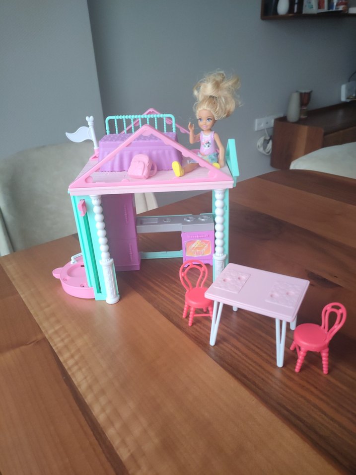 Pembe pastel renkli mini bebek evi, küçük bir bebek, masa ve iki sandalyeyle hayal gücünü destekler.