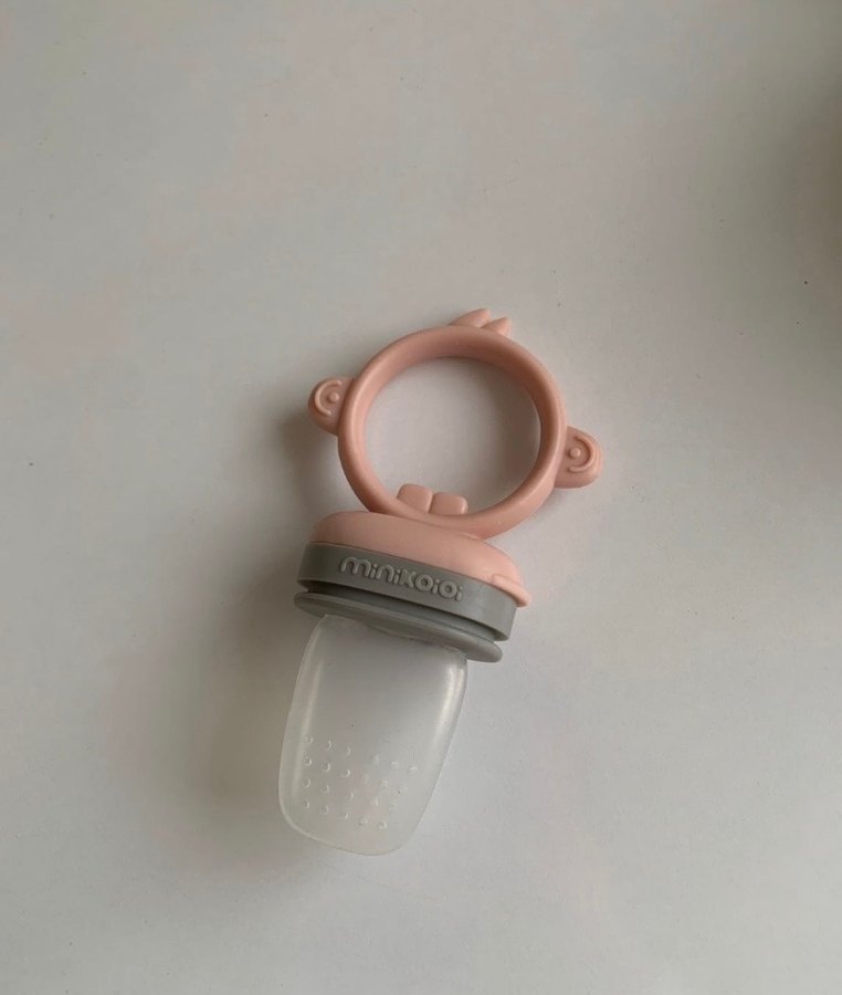 Pastel pembe renkli bebek emziği, yumuşak silikon uç ve kulak detaylı halka tutacağı ile rahatlatıcı ve diş çıkarma için uygundur. Meyve sebze alıştırıcısı