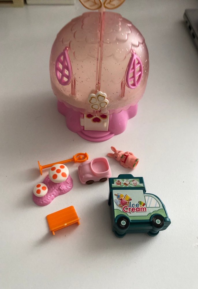 Yaprak şeklinde pencereleri olan pembe pastel mini bir ev ve dondurma kamyonu, tavşan figürü ile küçük aksesuarlar içerir.