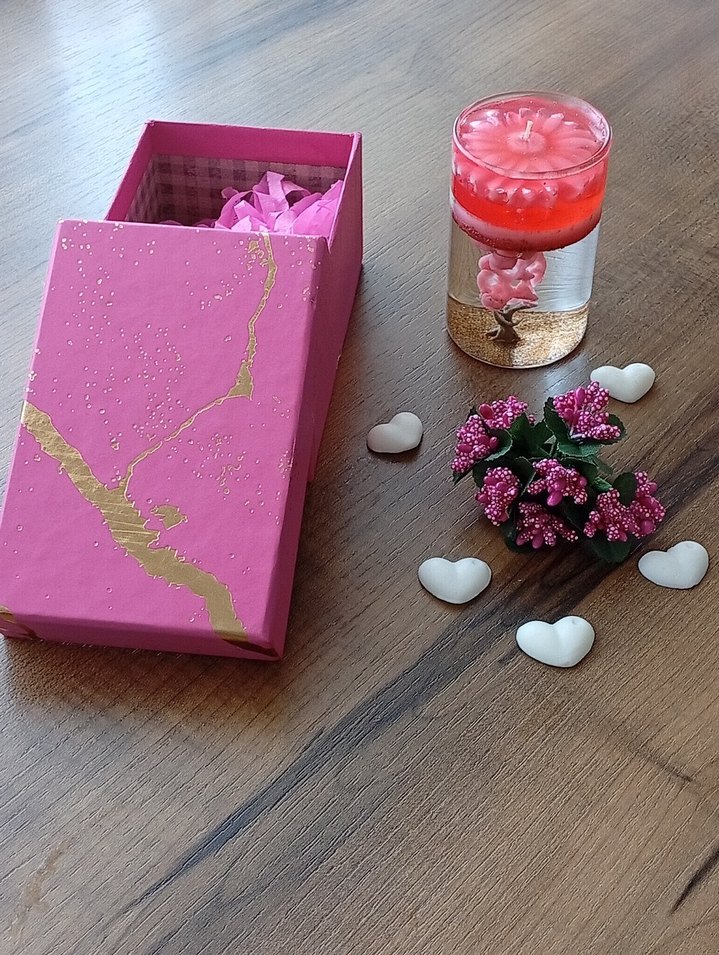 Altın detaylı pembe pastel hediye kutusu, dekoratif mum ve kalp şeklinde küçük objeler içerir.