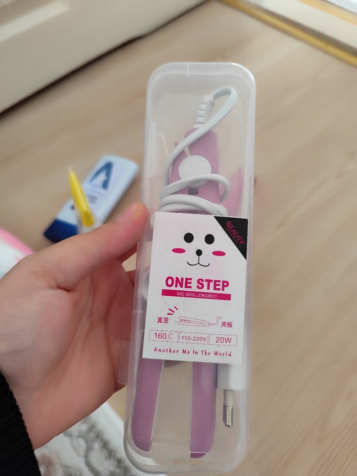 Pastel pembe renkte, 160°C ısıya ulaşan ve 20W güçte saç düzleştirici. Koruyucu kutusu ile güvenli saklama sağlar. mini saç düzleştirici