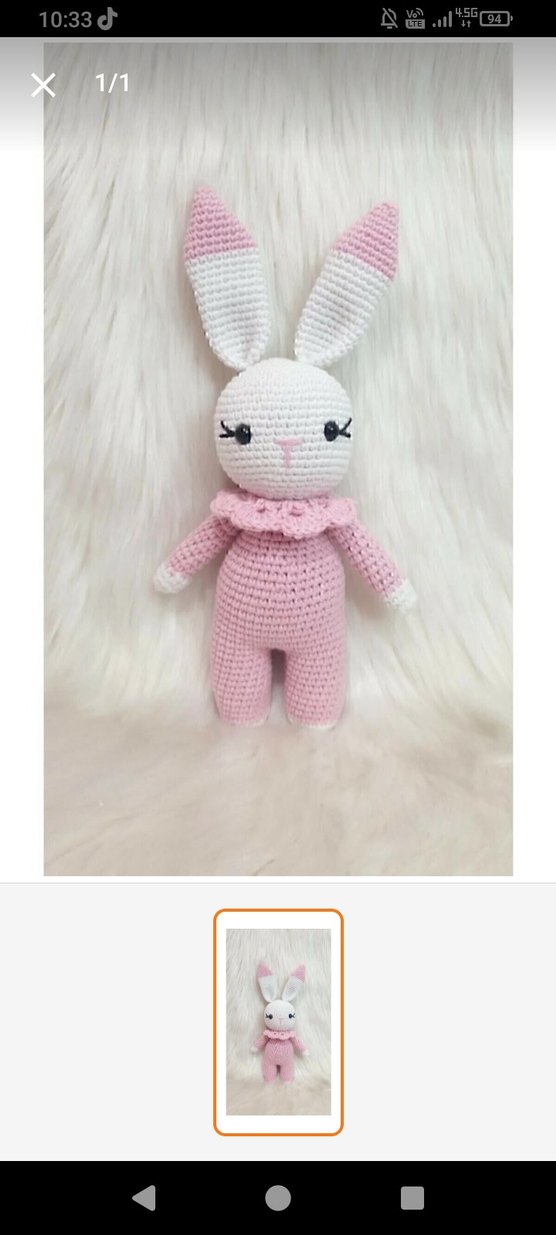 Uzun kulaklı, fırfırlı yakalı, yumuşak pembe pastel örgü tavşan peluş oyuncak.