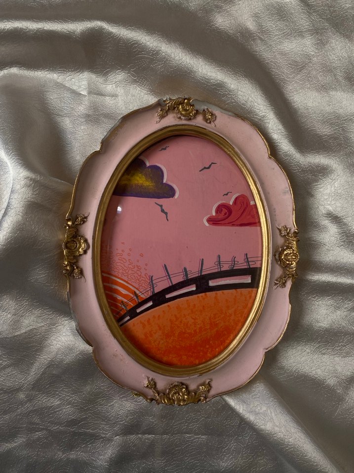 Altın detaylı süslü oval çerçeve, pastel pembe renkte olup vintage bir hava katmaktadır.