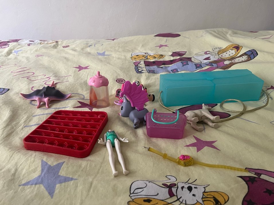 Yıldız desenli zeminde küçük pembe pastel at figürü, kıyafetsiz bebek, biberon ve çeşitli aksesuarlar içeren oyuncak seti. Tek tek alım için fiyat sorunuz
