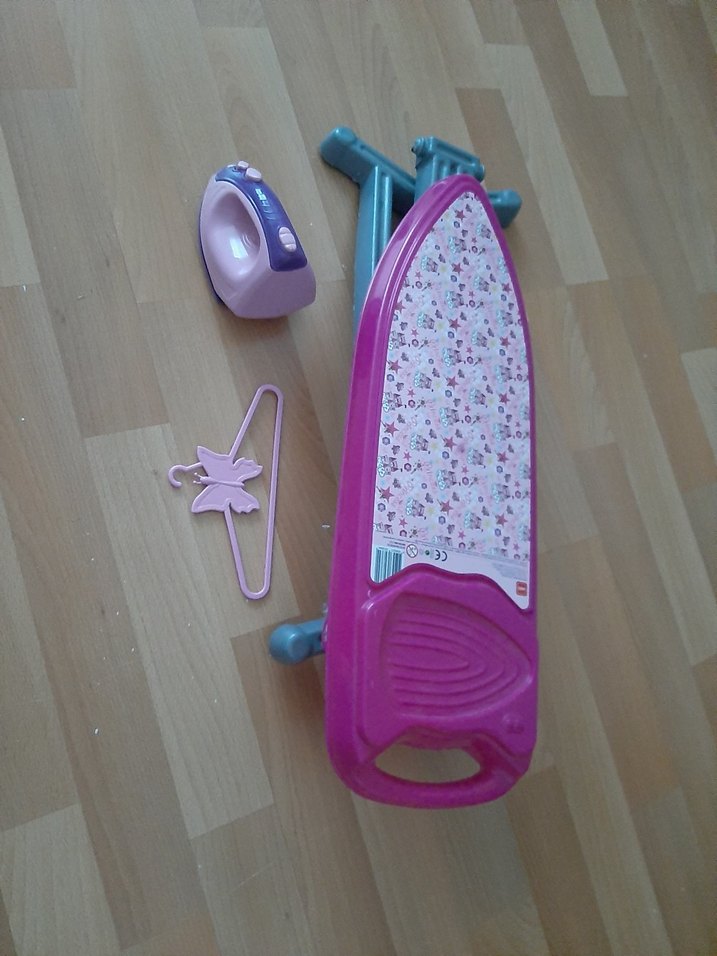 Pembe pastel oyuncak ütü seti, küçük ütü, desenli ütü masası ve perili pembe askı içerir. Çocuk oyunları için uygundur.