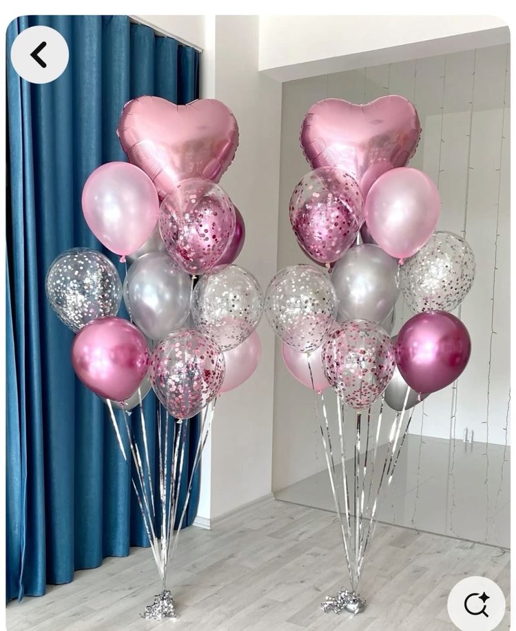 Pembe pastel kalp ve konfeti desenli balonlar içeren parti seti, çeşitli pembe ve gümüş tonlarıyla kutlamalar için uygun. İki adet kalp balon dört adet fuşya krom dört adet krom gümüş altı adet şeffaf balon Dört adet pembe balon 5 metre beyaz rafya