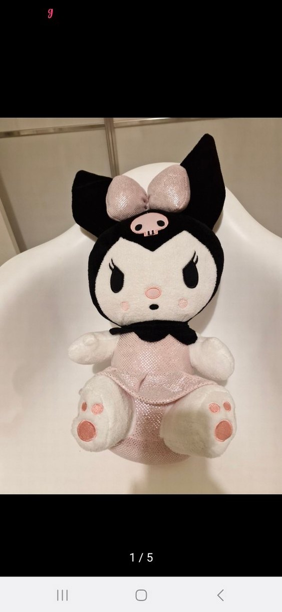Yumuşak pembe pastel tonlarda, siyah kulaklı ve fiyonk detaylı peluş oyuncak, sevimli karakter yüzü ve pati izleriyle.