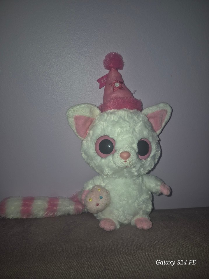Yumuşak pastel pembe ve beyaz peluş kedi oyuncak, pembe parti şapkası takıyor, büyük gözleri ve çizgili kuyruğu var.