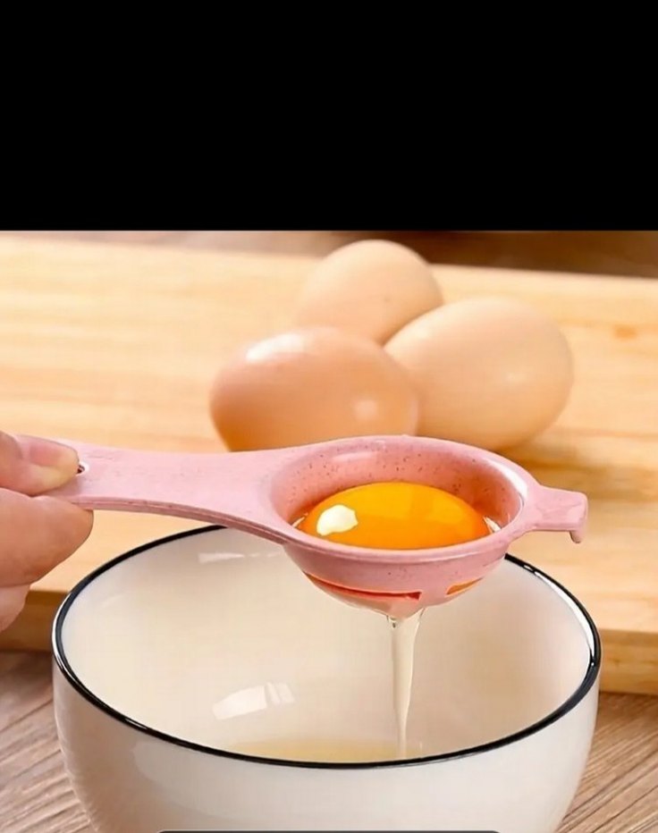 Pastel pembe renkte plastik yumurta sarısı ayırıcıdır. Yumurta beyazını süzerek ayırmayı kolaylaştırır.