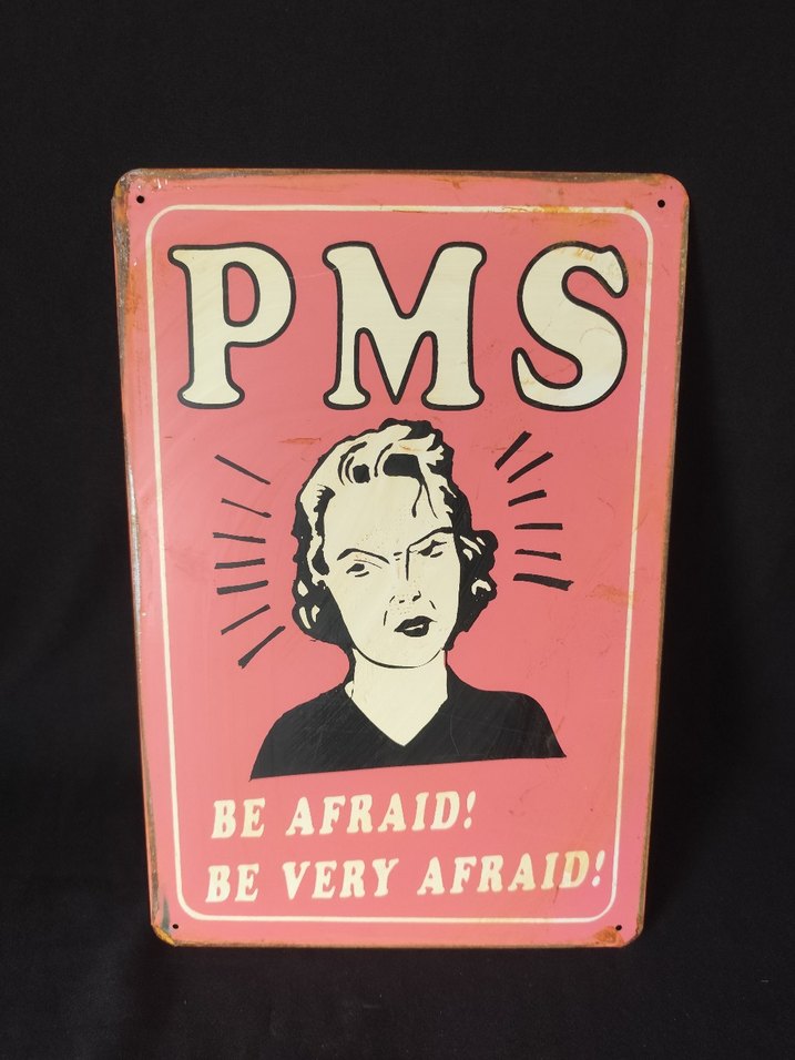 Pastel pembe metal tabela üzerinde büyük beyaz PMS harfleri ve kadın illüstrasyonu bulunur. "BE AFRAID! BE VERY AFRAID!" yazısı dikkat çeker. Hafif paslı, retro tarzda. ölçüler 30x20cm