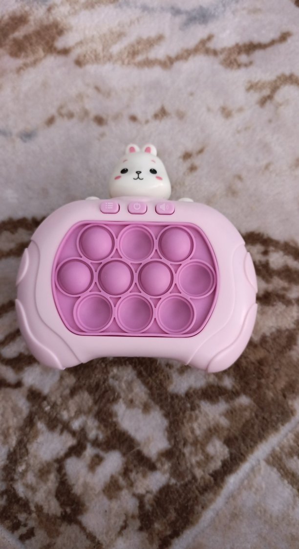 Üstünde sevimli hayvan figürü bulunan pembe pastel renkte, pop-it kabarcık tasarımlı eğitim oyuncağıdır. pilli ve çok iyi durumda