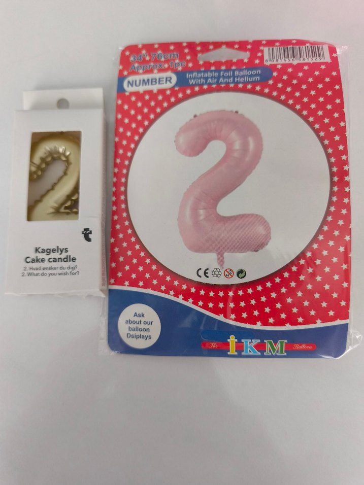 Pastel pembe şişme 2 rakam balon ve altın renkli 2 şeklinde pasta mumu, parti süsü olarak kullanılır.