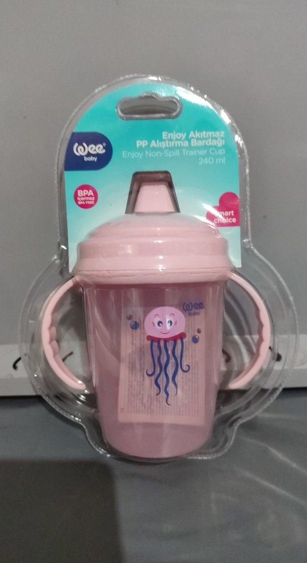 Pembe pastel renkli, dökülmeyi önleyen tasarıma sahip 240 ml kapasiteli bebek alıştırma bardağı. İki kulplu ve BPA içermez.