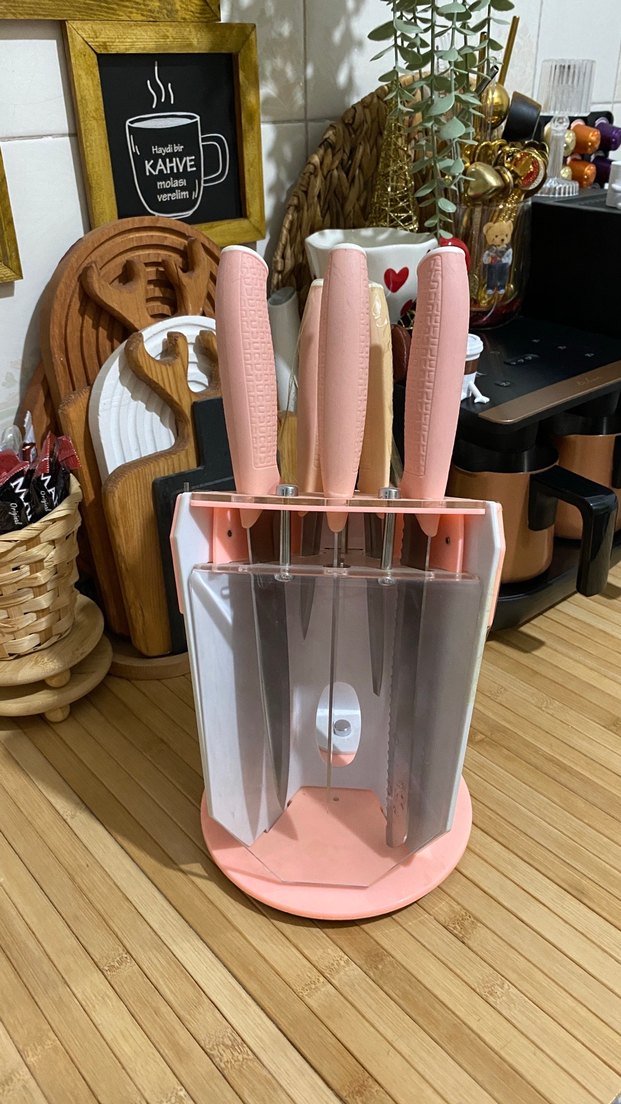Pastel pembe renkte, dokulu saplı dört bıçak ve döner stand içerir. Mutfakta kullanıma uygundur. Standın şeffaf bölümü bıçakları tutar.
