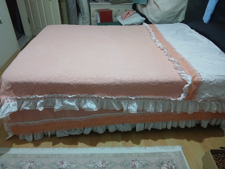 Pembe pastel renkte, yumuşak dokulu, kenarlarında beyaz fırfırlar bulunan yatak örtüsü.