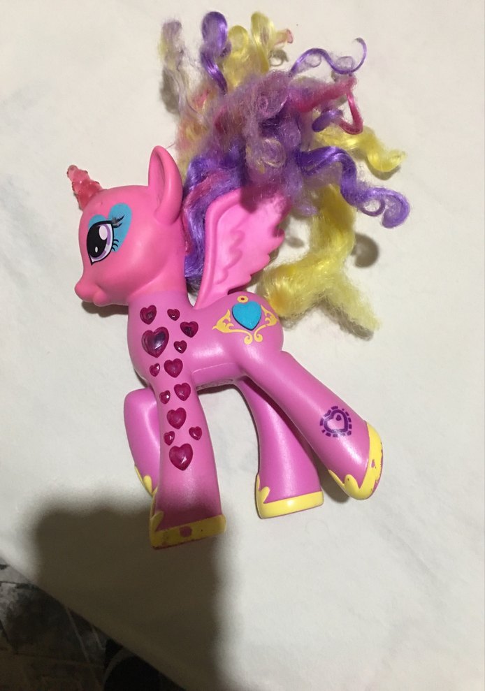 Pembe kanatlı oyuncak at, mor, sarı ve pembe kıvırcık pastel saçlara sahiptir. Vücudunda kalp ve kuş desenleri, toynaklarında sarı detaylar bulunur. Ürün çalışıyor isteyene whatsaptan atarım konuşuyor şarkı söylüyor 21 cm prenses cadance poly saçları düzeltilecek başka sorunu yok