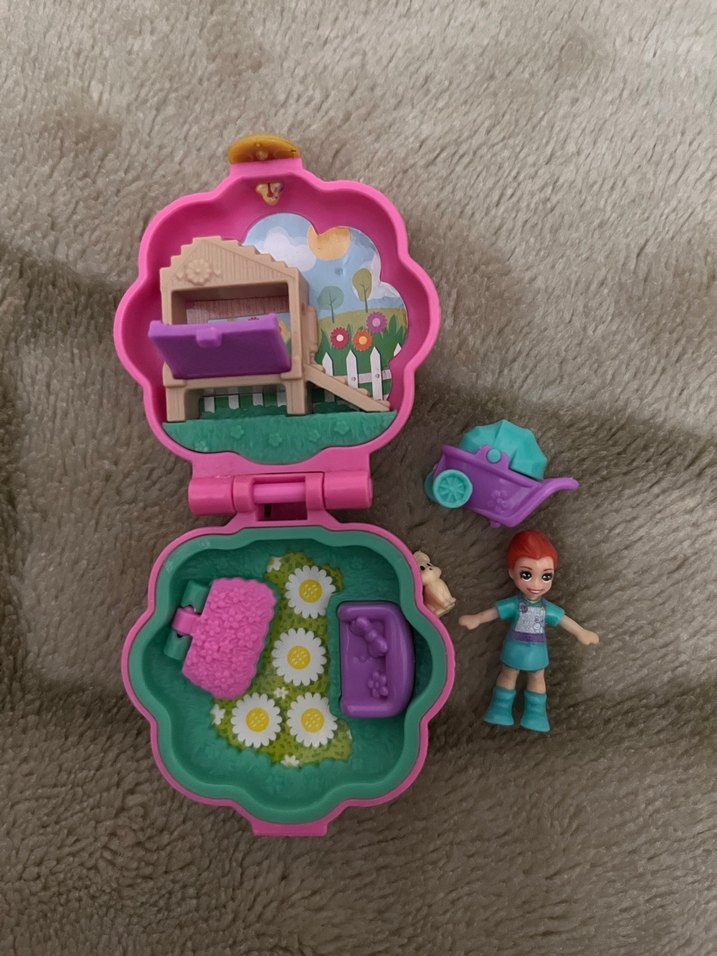 Pastel pembe renkli küçük oyuncak bebek seti, bahçe temalı oyun alanı ve mini aksesuarlar içerir.