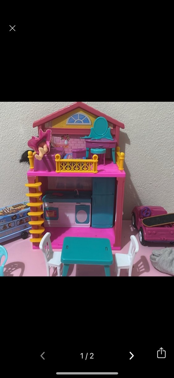 İki katlı, pembe pastel renkli oyuncak ev seti. İçinde masa, sandalyeler ve mutfak eşyaları bulunur. Yeni almıştık bir tane de hediye geldiği için bu fazladan