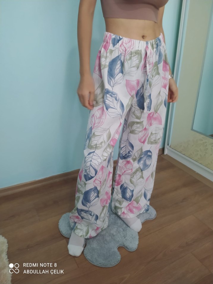 Yumuşak sentetik kumaştan yapılmış, yaprak desenli pastel pembe salaş kadın pantolon, drapeli tasarıma sahip. Günlük kullanıma uygun rahatlık sunar.