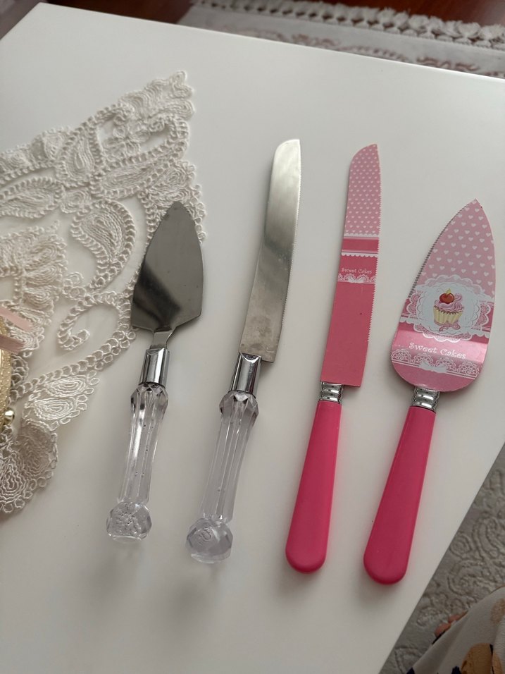 Pembe pastel renkli, şeffaf ve pembe saplı iki bıçak ve iki pasta servis seti, tatlılar için uygundur.