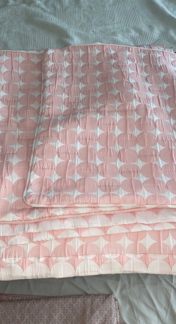 Yatak örtüsü, pastel pembe renkte ve hafif geometrik desende, yatak odasına yumuşak bir dokunuş katar. ️