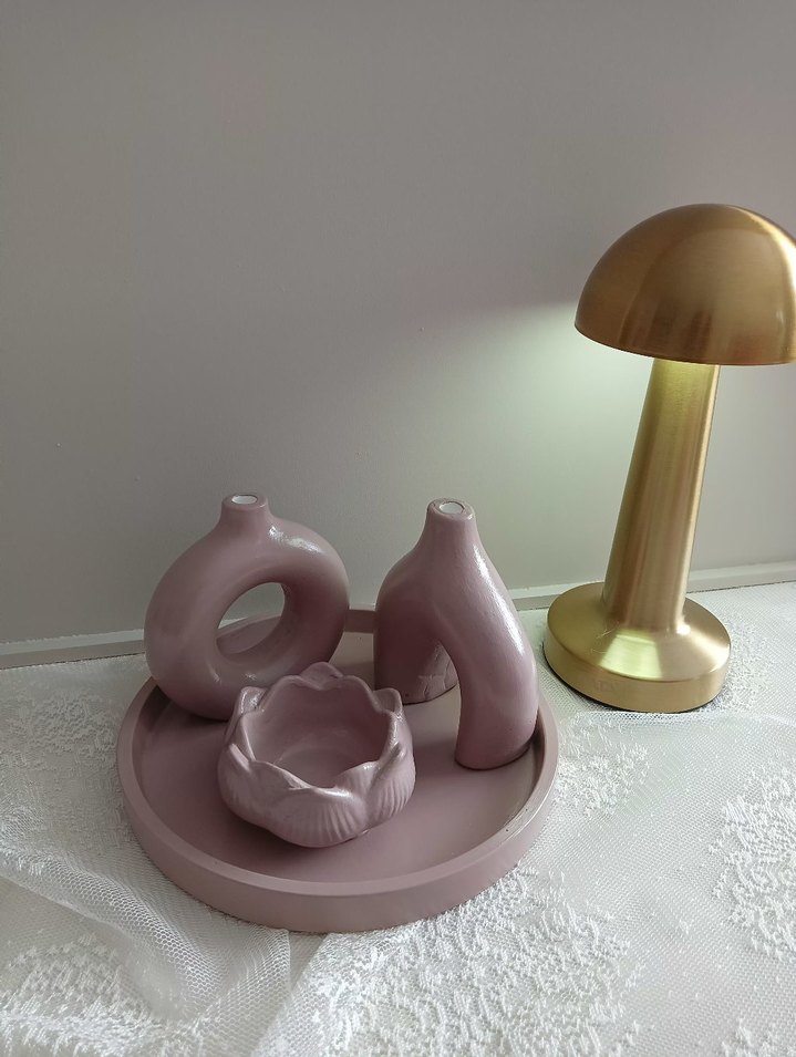 Pastel pembe seramikten yapılmış, yuvarlak tepsi ve üç farklı şekilli vazodan oluşan dekoratif set.