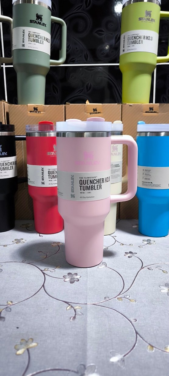 Pembe pastel renkte Stanley Quencher Tumbler, geniş saplı ve içeceklerin gün boyu ideal sıcaklıkta kalmasını sağlar. Dayanıklı yapıya ve güvenli kapağa sahiptir.