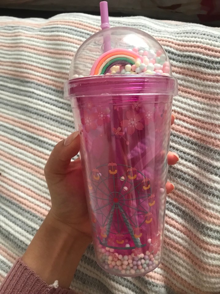 Pembe pastel renkli, kapaklı ve pipetli plastik bardak. İçinde renkli boncuklar ve üzerinde dönme dolap deseni bulunur.