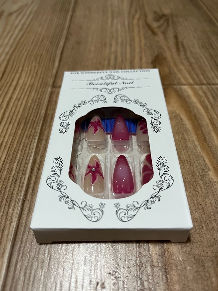 Pastel pembe tırnak süslemeleri, zarif çiçek desenleri ve parlak yüzeye sahiptir. 24 adet tırnak 24 adet yapıştırıcı bir adet törpü